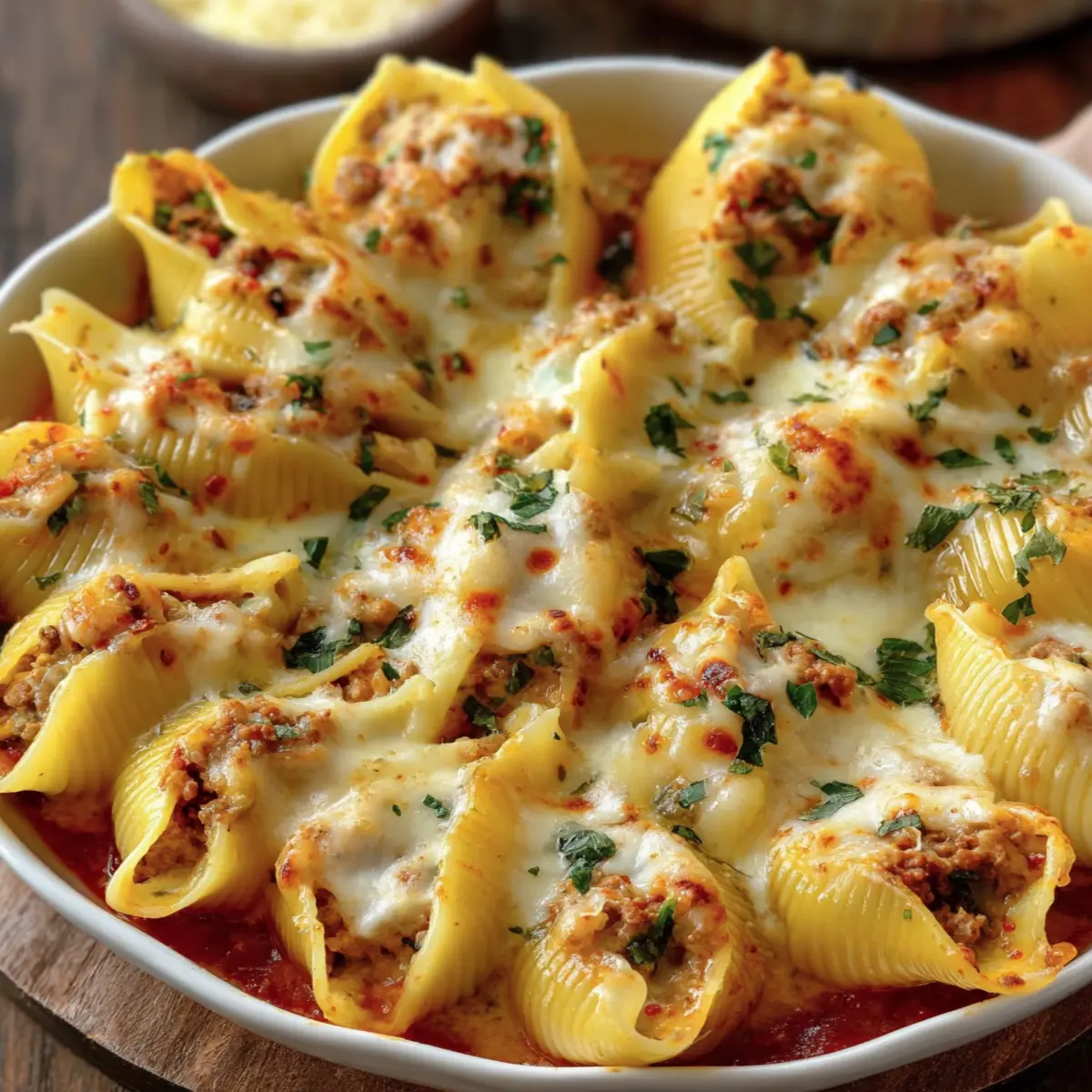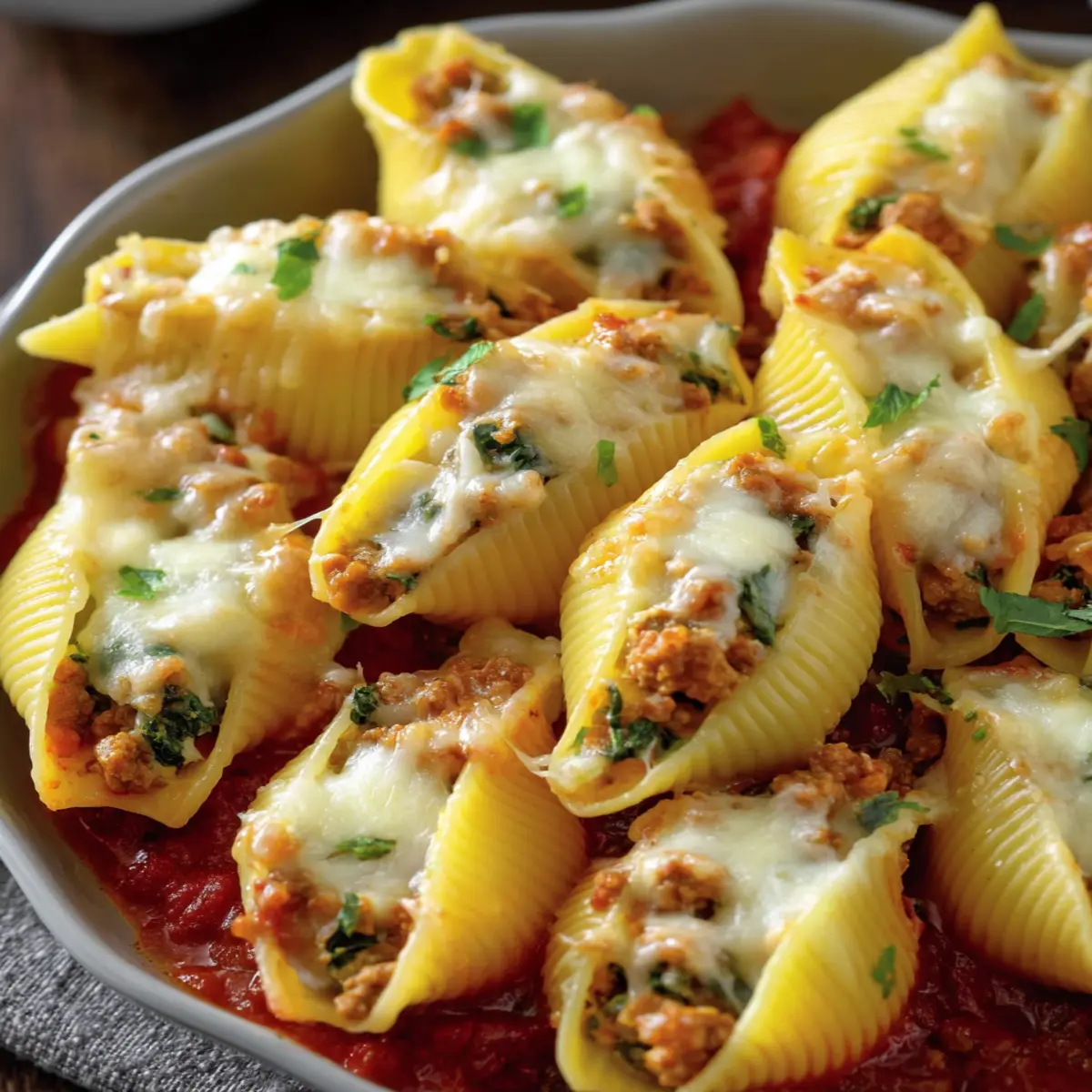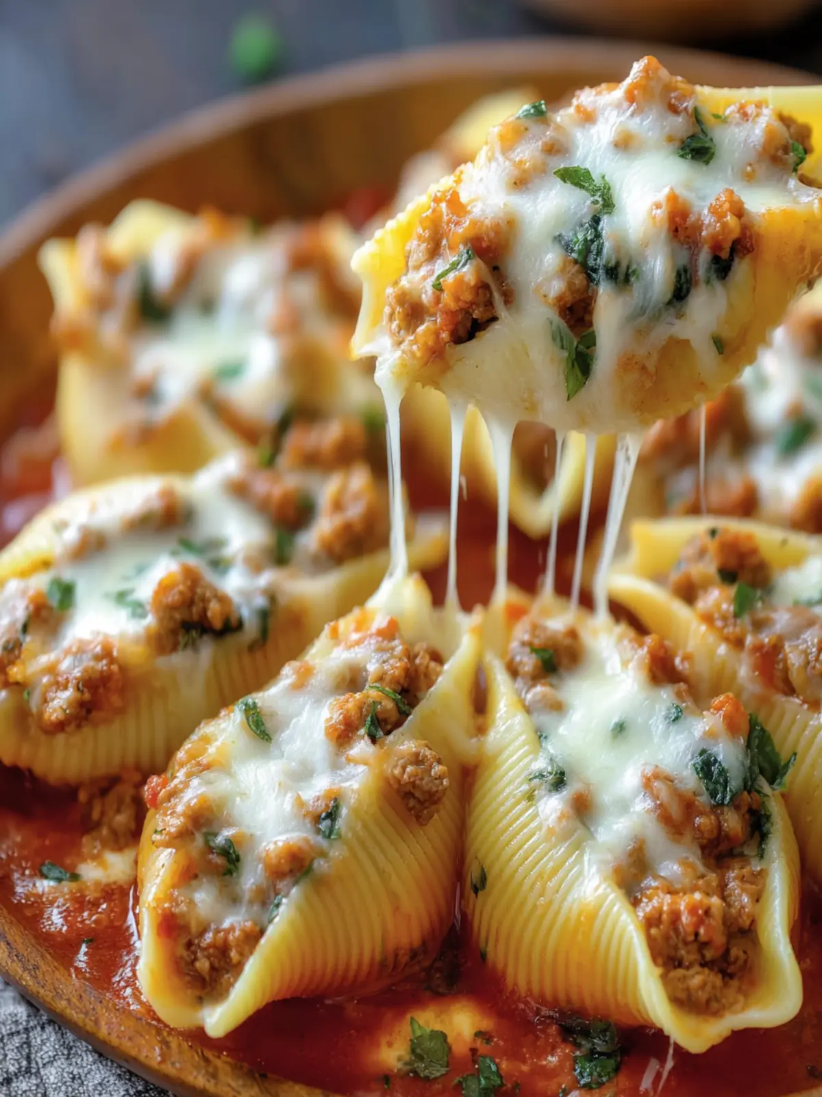 Delicious baked stuffed pasta shells filled with a savory meat and cheese mixture, topped with marinara sauce and melted cheese.