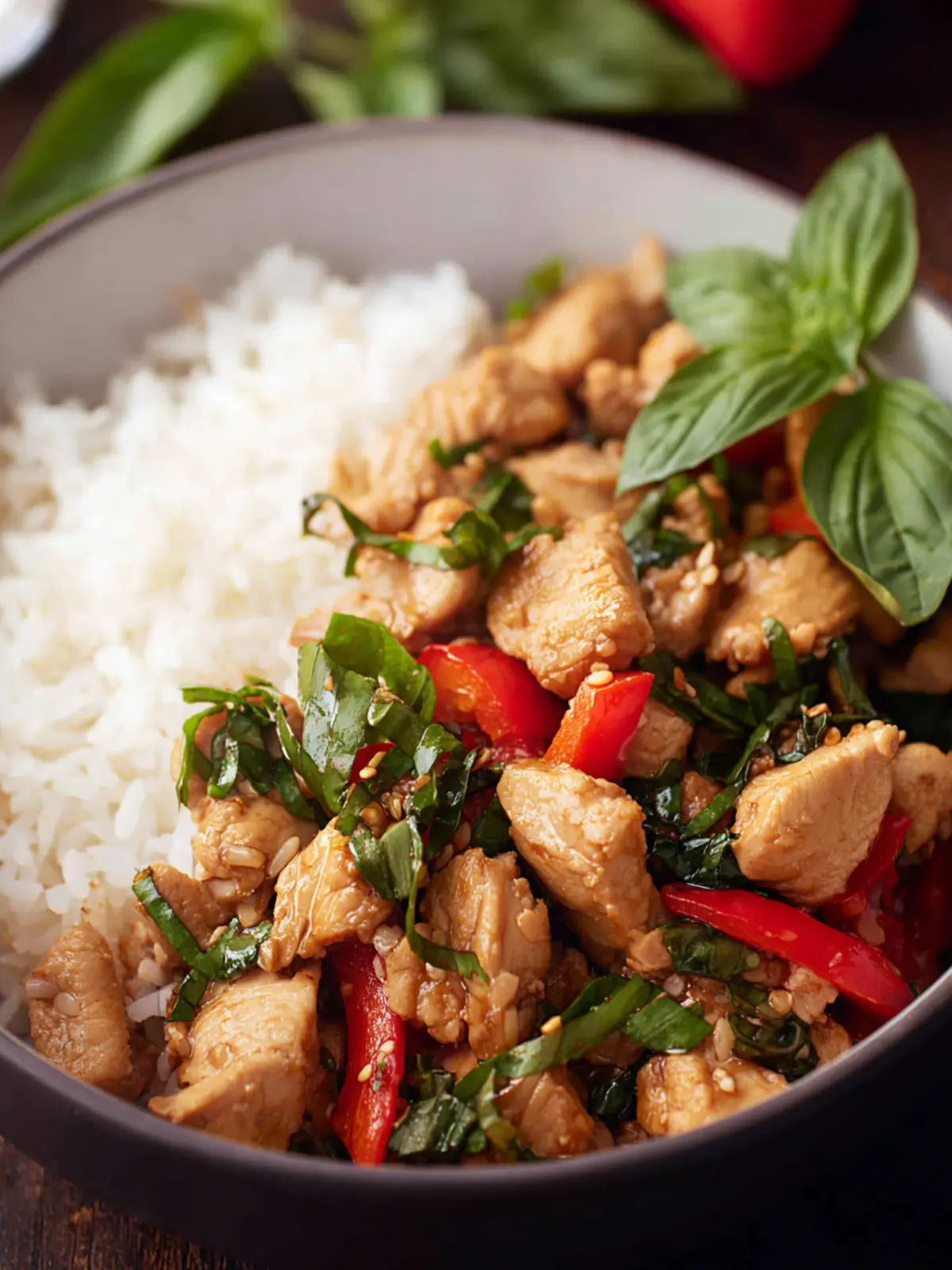 Vegetables: Bell peppers, onions, and snap peas bring both color and crunch. Each adds its unique texture and sweetness, creating a medley that complements the basil perfectly.
