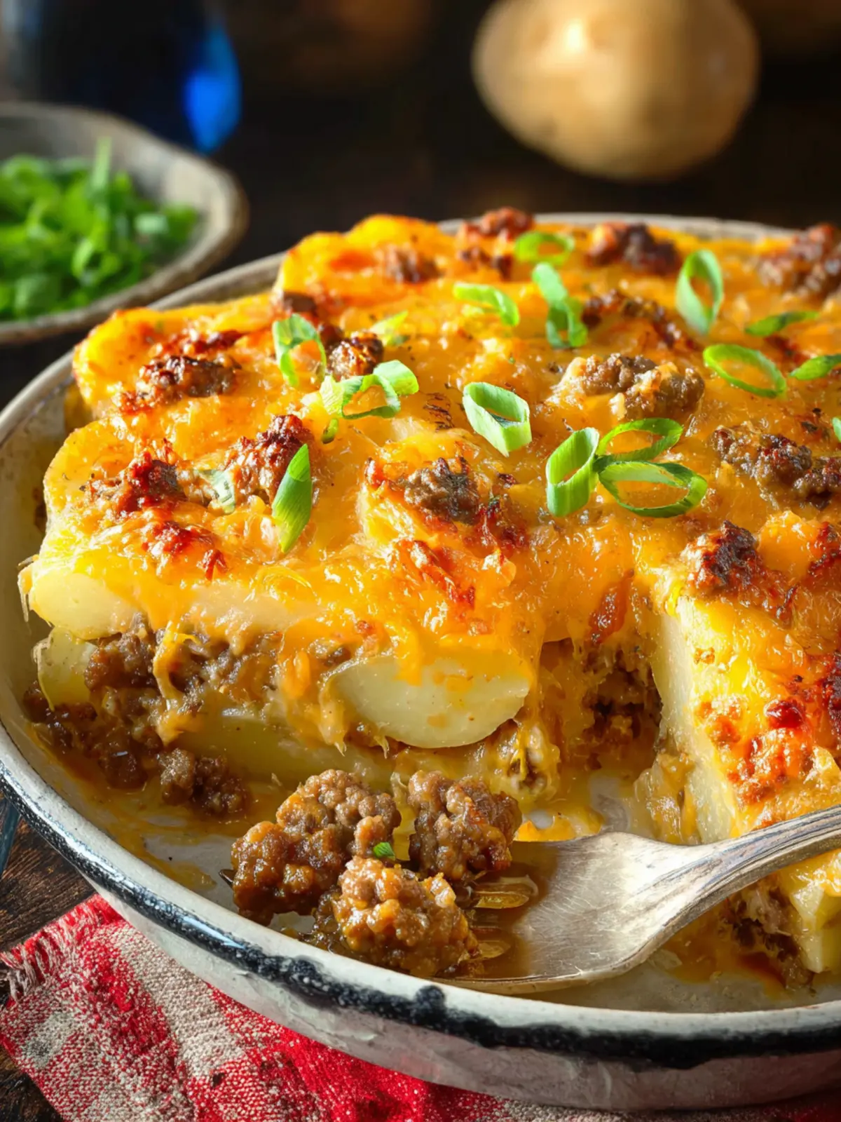 A comforting casserole featuring layers of sliced potatoes, ground beef, and a creamy cheddar cheese sauce.