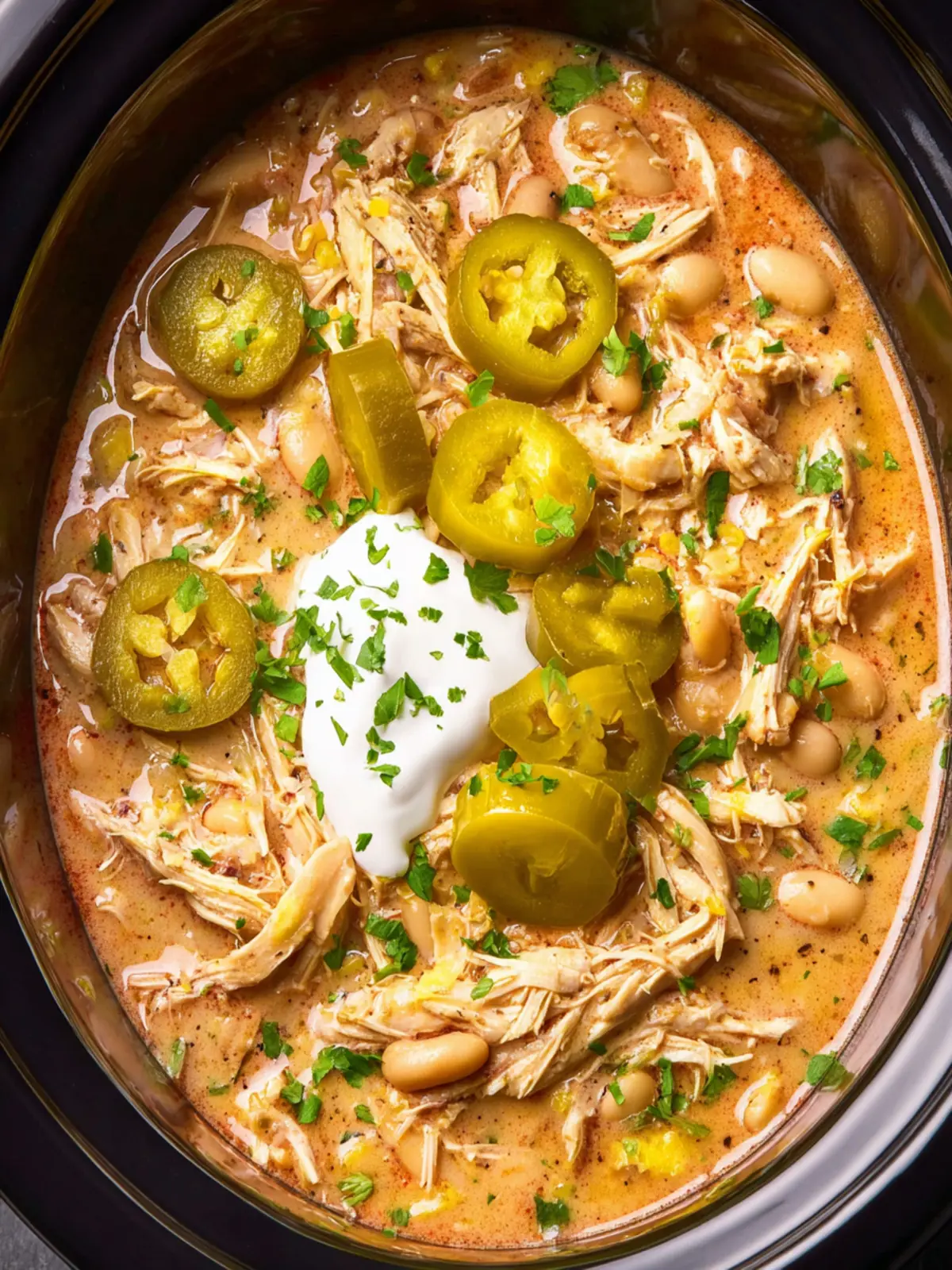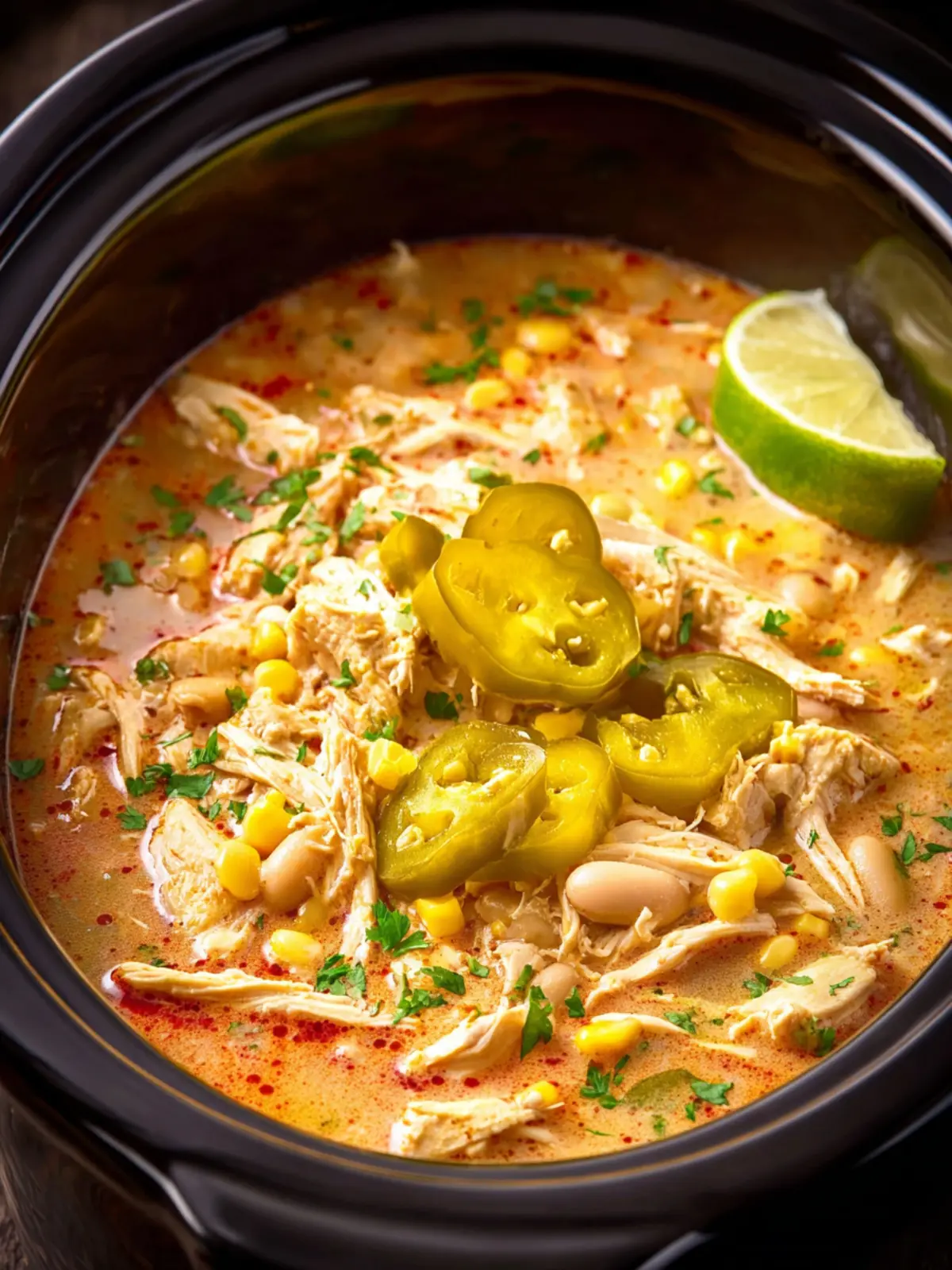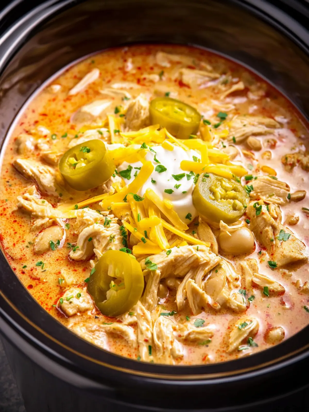 A delicious and creamy chicken chili cooked in a crock pot, perfect for a hearty meal.