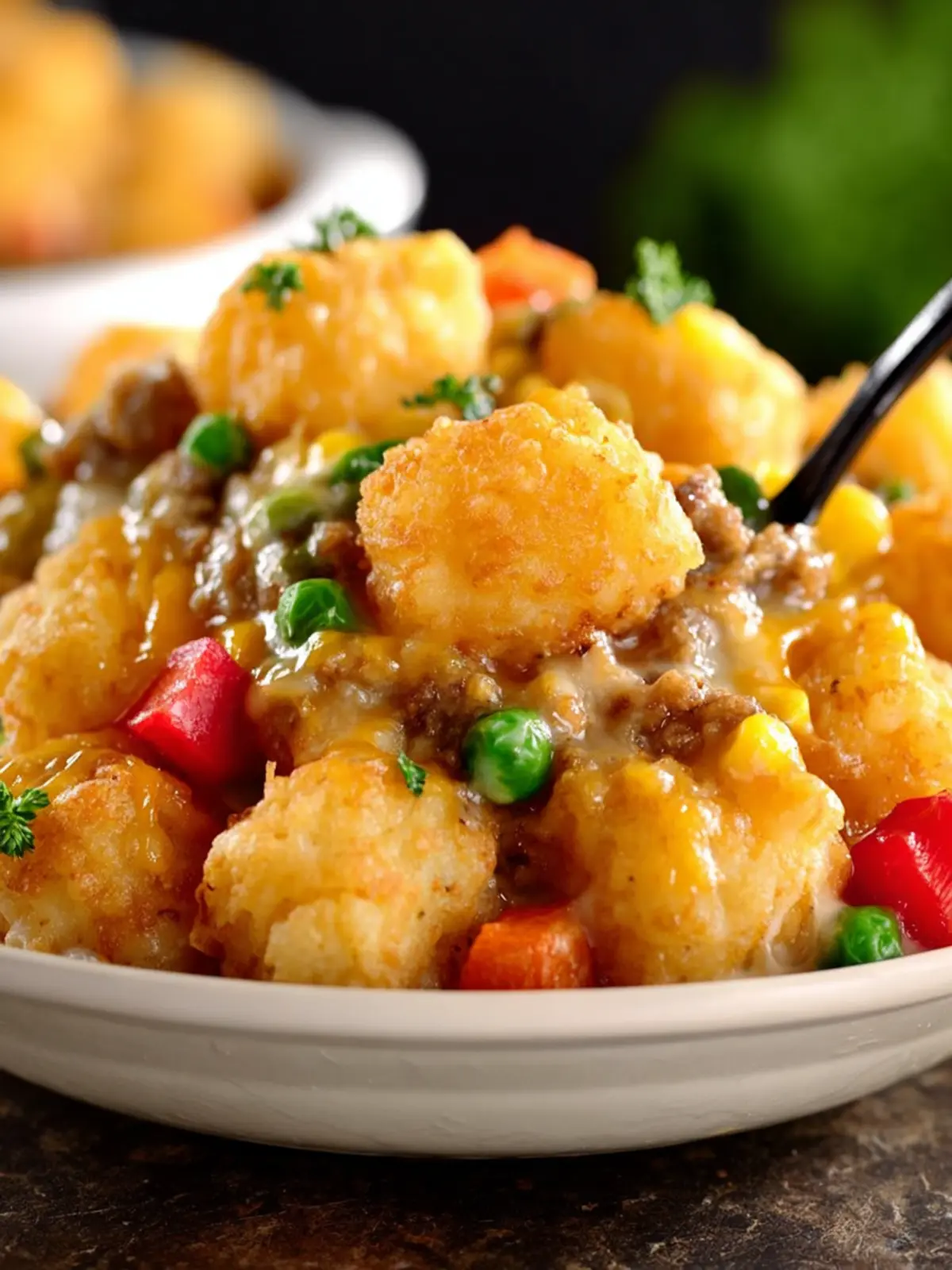 A delicious and comforting casserole made with tater tots, ground beef, mixed vegetables, and cheese, perfect for family dinners.