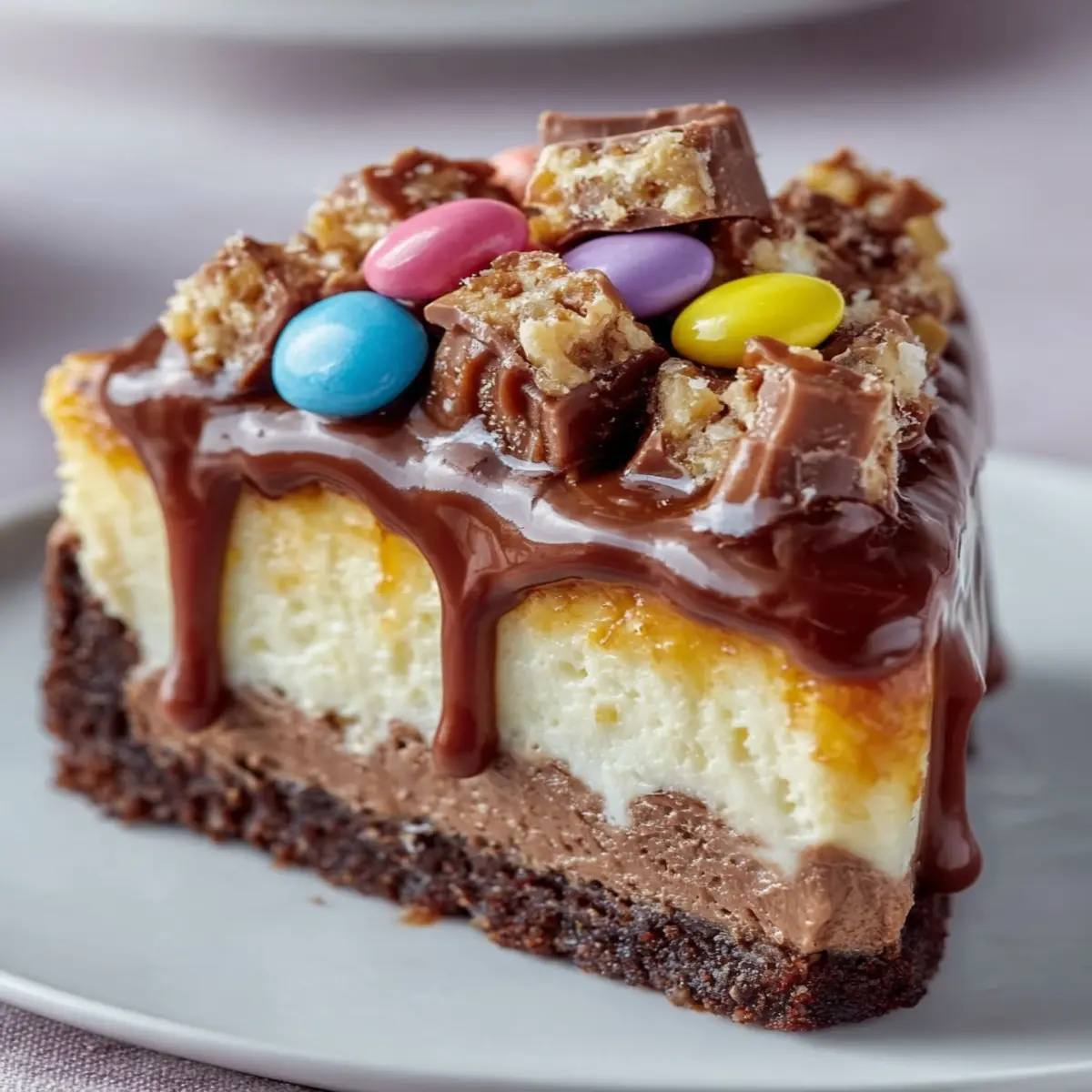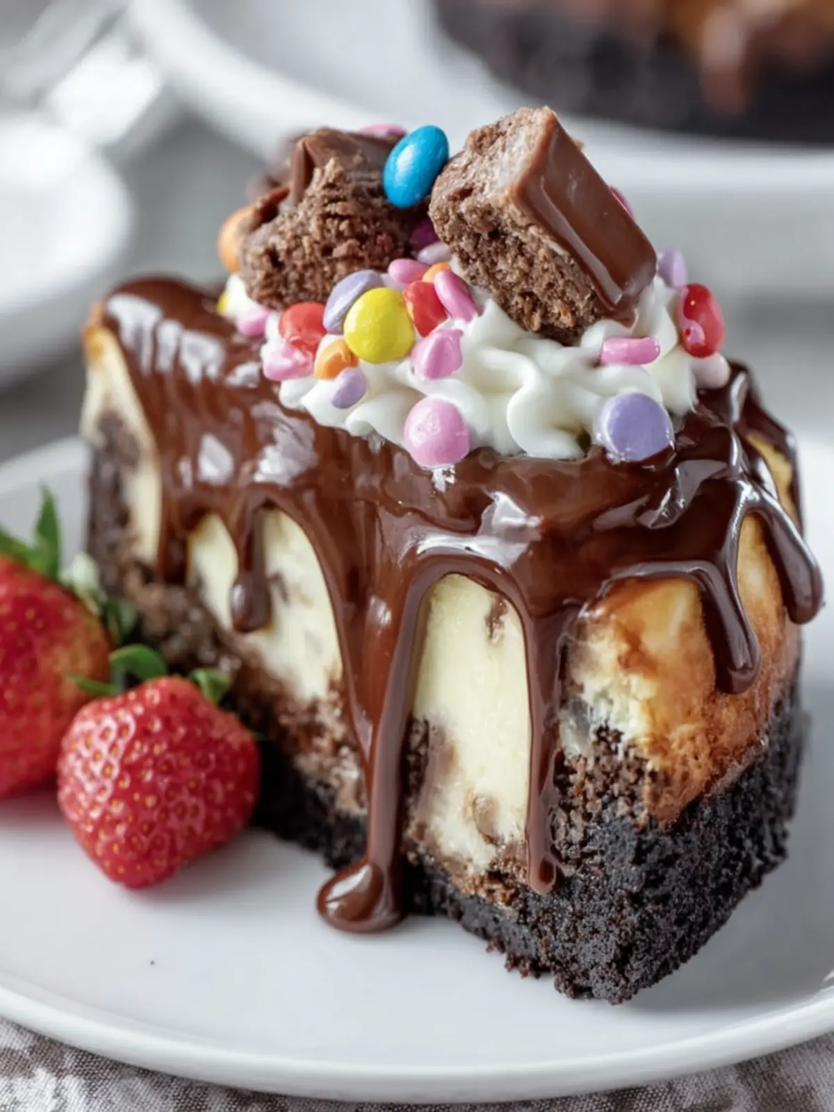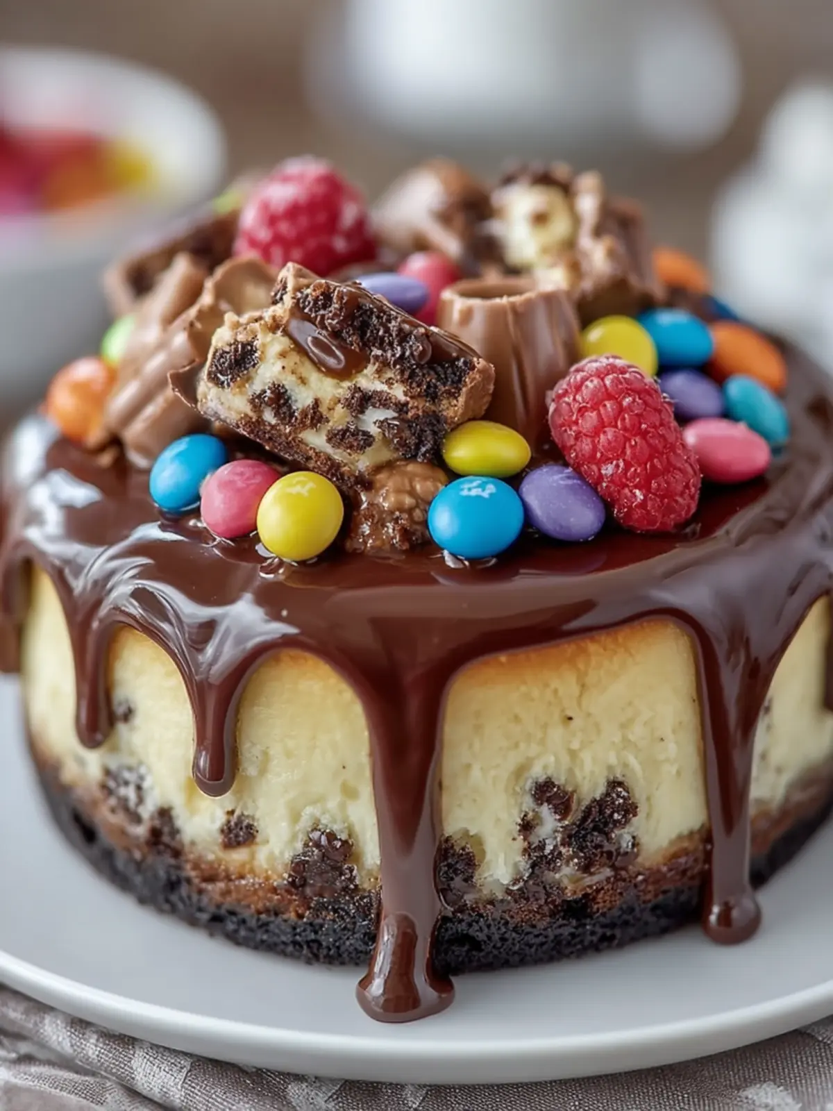 A rich and creamy cheesecake topped with chocolate ganache and assorted chocolate candies, perfect for any celebration.