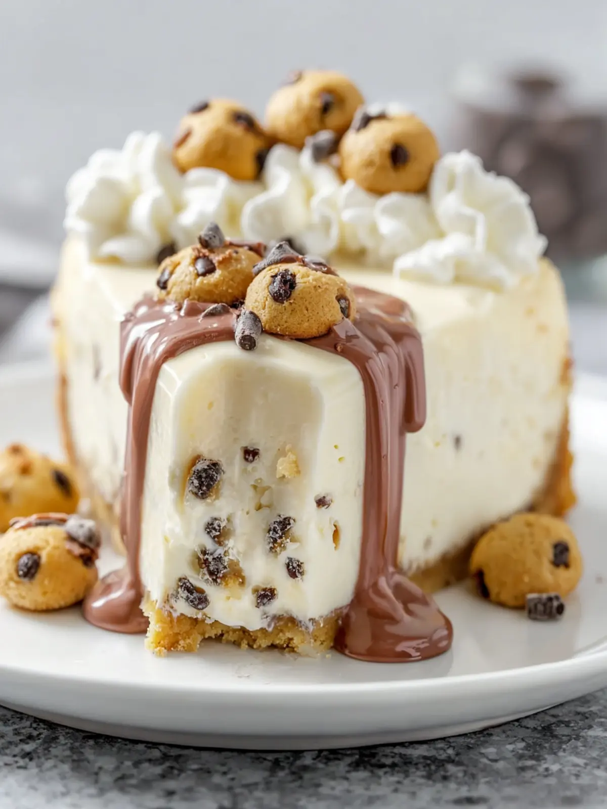 - Before serving, top the cheesecake with the set-aside cookie dough balls.