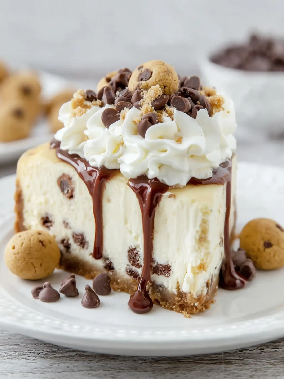 - Before serving, top the cheesecake with the set-aside cookie dough balls.