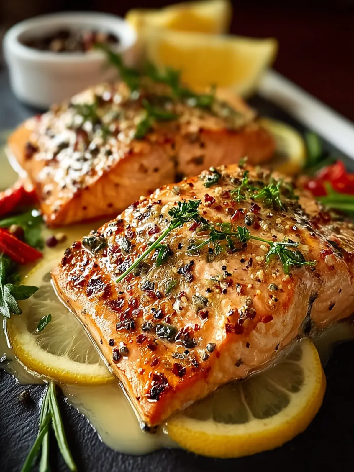 - After removing from the oven, let the salmon rest for a couple of minutes. Then, garnish with fresh parsley and serve with lemon wedges on the side.