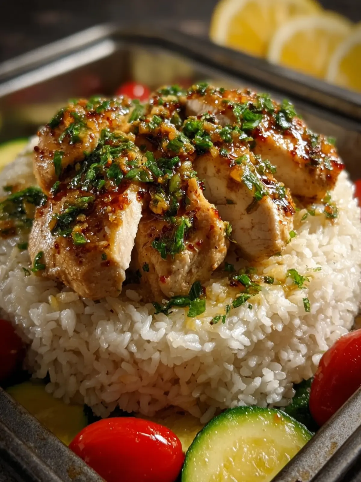 A delicious and healthy meal featuring juicy lemon chicken served over fragrant cilantro brown rice.