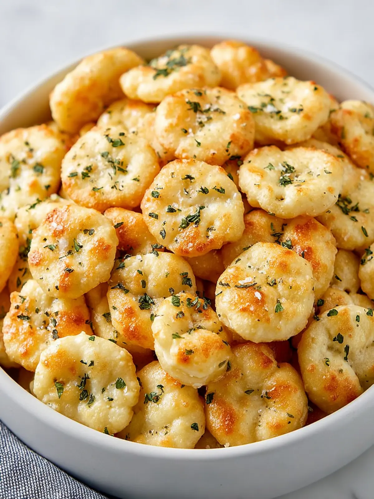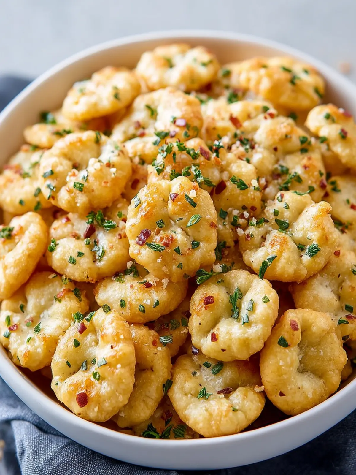 A delicious snack featuring oyster crackers seasoned with ranch flavor and herbs.