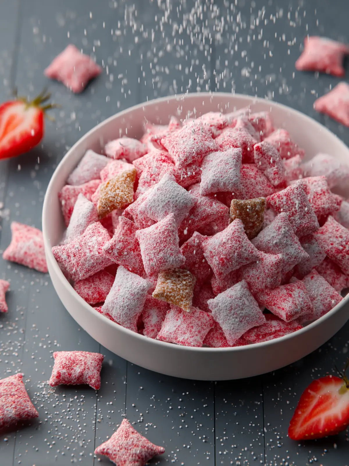 Powdered Sugar: This sweet sprinkle adds a delightful finish to our snack. It not only enhances the sweetness but also gives the beloved strawberry puppy chow its signature snow-like appearance.