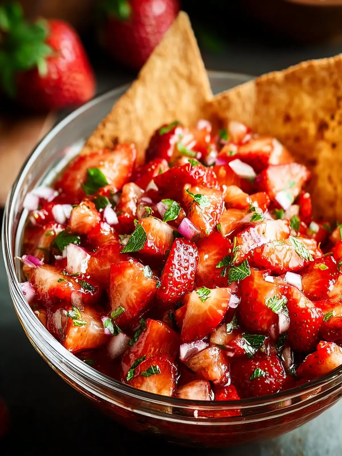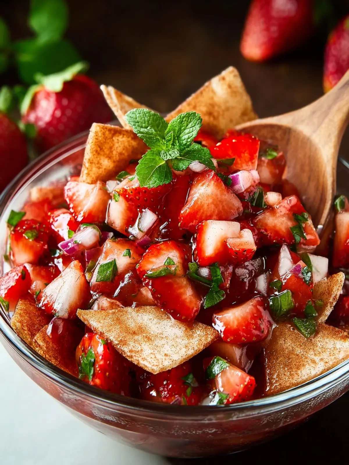 A refreshing strawberry salsa served with crispy cinnamon chips, perfect for dipping.