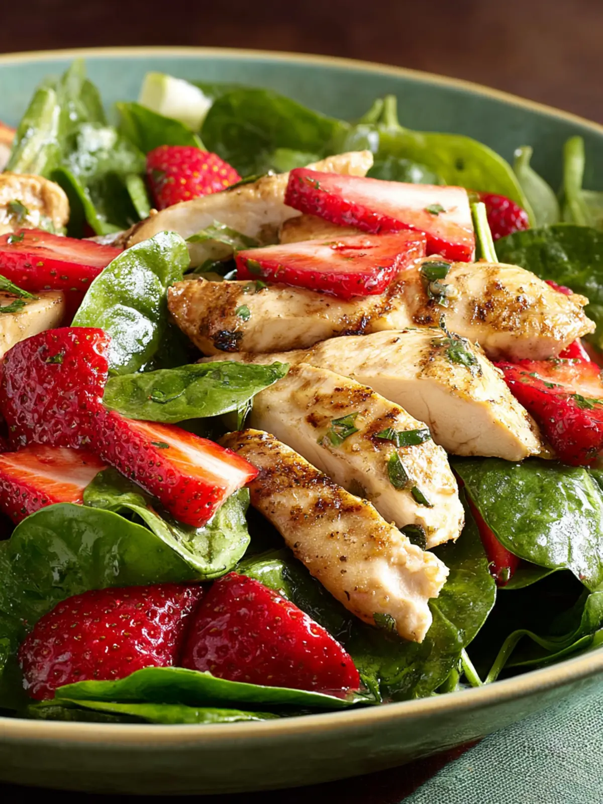 • Combine your ingredients just before serving to keep the spinach crisp and fresh. Toss everything gently, ensuring the chicken and strawberries are evenly distributed throughout the salad.